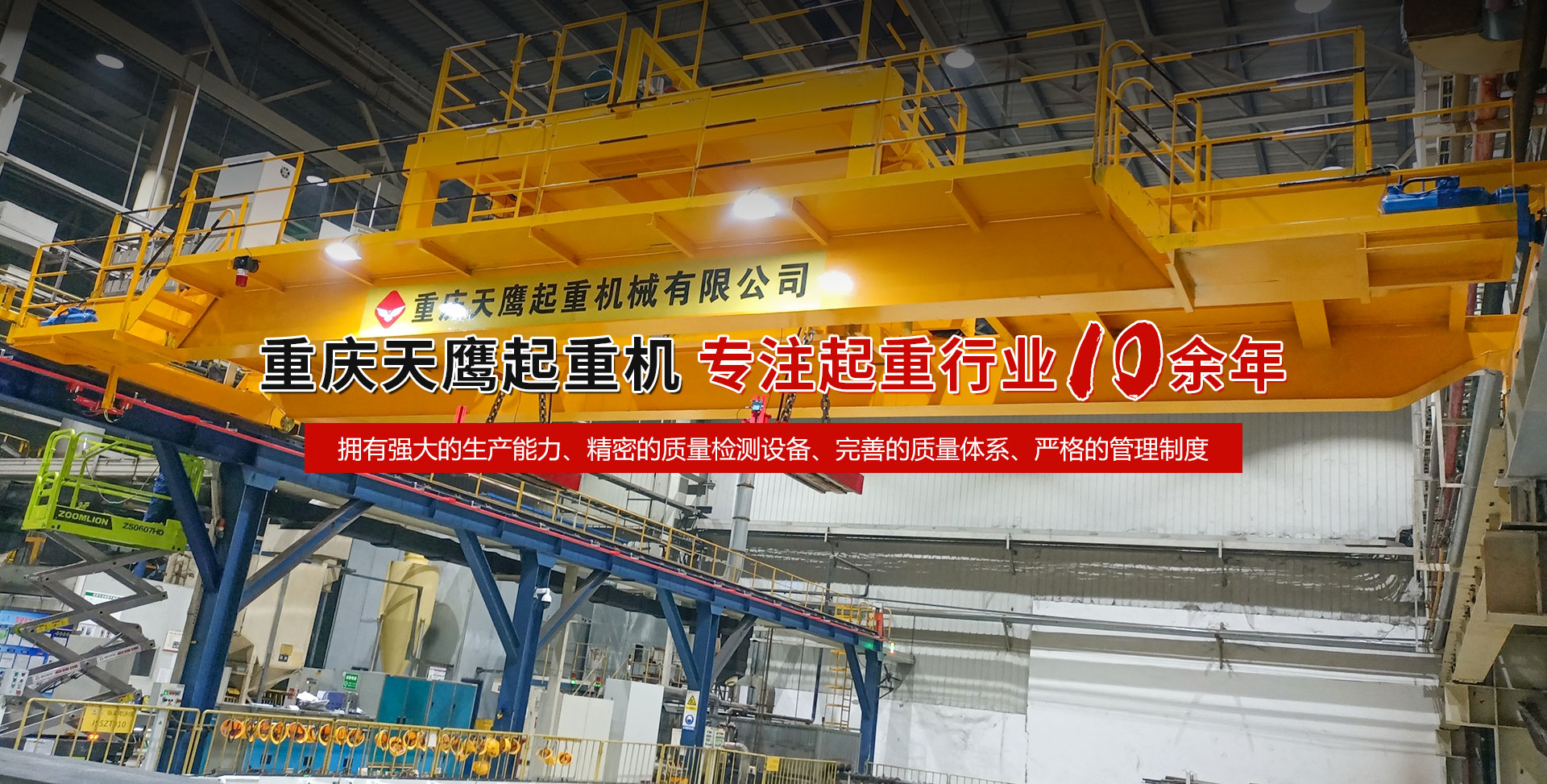 重慶天鷹起重機(jī)械有限公司成立于2014年,主營(yíng)起重機(jī)的銷售、安裝和維護(hù)等相關(guān)服務(wù)。中國(guó)重型機(jī)械工業(yè)協(xié)會(huì)員單位、為中國(guó)工程機(jī)械工業(yè)協(xié)會(huì)工程機(jī)械維修分會(huì)會(huì)員單位及西南地區(qū)起重機(jī)械定點(diǎn)安裝維修單位。具有國(guó)家質(zhì)量監(jiān)督檢疫總局頒發(fā)的特種設(shè)備安裝維修改造質(zhì)格證書。并率先通過(guò)了IS09001-2000質(zhì)量體系認(rèn)證。 公司注冊(cè)資金3000萬(wàn)元;廠房面積2萬(wàn)平方米;各種生產(chǎn)檢測(cè)設(shè)備50臺(tái)套,公司技術(shù)力量雄厚,聘請(qǐng)了國(guó)內(nèi)知名起重機(jī)專家、工程技術(shù)人員擔(dān)當(dāng)項(xiàng)目經(jīng)理、技術(shù)總工程師及顧問(wèn)。現(xiàn)擁有員工100多人,其中工程技術(shù)人員12人。 主導(dǎo)產(chǎn)品為各類橋、門式起重機(jī)及輕小型起重設(shè)備,具備生產(chǎn)起重量200t及以下通用橋、門式起重機(jī)的能力,尤其在200t以下起重機(jī)產(chǎn)品上具備較強(qiáng)的市場(chǎng)競(jìng)爭(zhēng)力,為許多行業(yè)設(shè)計(jì)制造了技術(shù)含量高、技術(shù)性強(qiáng)的起重設(shè)備,許多產(chǎn)品在原設(shè)計(jì)標(biāo)準(zhǔn)上進(jìn)行了較大的改進(jìn)、優(yōu)化和創(chuàng)新;其中NH型系列電動(dòng)葫蘆、HD型電動(dòng)單梁處于國(guó)內(nèi)高水平..... 好的產(chǎn)品品質(zhì)需要由較高的裝備水平來(lái)保證,公司購(gòu)買了“大型數(shù)控落地鏜”、“數(shù)控切割機(jī)床”、“自調(diào)式焊接滾輪機(jī)”、“數(shù)顯液壓板料折彎?rùn)C(jī)”、“超大型數(shù)控臥式車床”、“數(shù)控液壓水平下調(diào)式三輥卷板機(jī)”、“單柱移動(dòng)式立式車床”“擁有用于單梁生產(chǎn)的全國(guó)一條拋丸噴漆烘干線、葫蘆噴漆烘干線和全國(guó)較大的100T葫蘆試驗(yàn)臺(tái)和檢測(cè)中心”等各種先進(jìn)的加工設(shè)備,新建廠房面積近2萬(wàn)平方米。 質(zhì)量是企業(yè)的生命,天鷹公司依據(jù)“ISO 9001國(guó)際質(zhì)量管理體系”標(biāo)準(zhǔn),制定并完善了公司的質(zhì)量管理體制。堅(jiān)持質(zhì)量體系的內(nèi)審和外審,將質(zhì)量管理工作落實(shí)到企業(yè)生產(chǎn)經(jīng)營(yíng)的全過(guò)程。 您的微笑,是天鷹永恒的追求;天鷹的服務(wù),是您首要的選擇!因?yàn)槲覀儓?jiān)信:“誠(chéng)信是本、質(zhì)量鑄就品牌”。為您服務(wù)是我們的榮耀,勤奮而進(jìn)取的天鷹人,時(shí)刻期盼著您的到來(lái)。